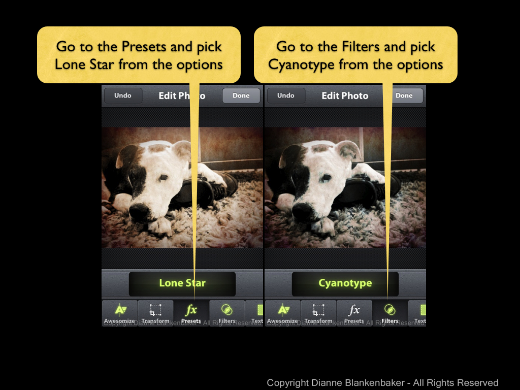 Next, I added a preset and a filter. If you need detail instructions, you can look back at lesson 12, just choose the Lone Star preset and the Cyanotype filter.
