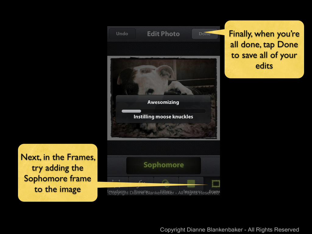 Finally, we’re going to add a frame to the photo–I didn’t show all the screens, but it’s basically a repeat of selecting a filter. The main difference is when you’re done, it’s time to tap the done button.