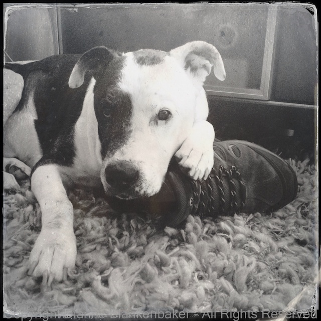 This is what I got using the Helga Viking lens and D-type plate film in Hipstamatic of my dog taking possession of my husband’s shoes: