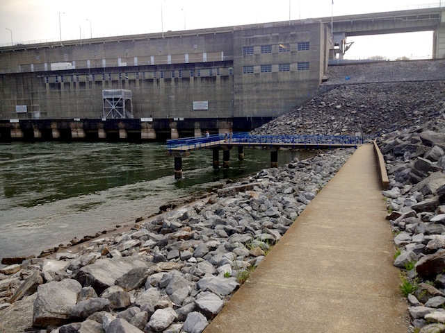 The photo on the left captures the Tennessee Aquarium across the river.  While the piece of foreground tree branches in the lower right (which are otherwise more of a distraction than a help) and the shadows on the river in front of the aquarium help create some sense of three dimensions, it’s what one might call a “flat” photo.