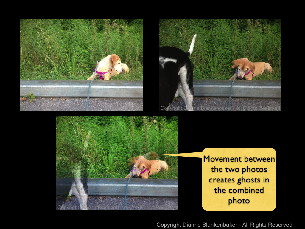 Combining two images helps get better exposure, but the inherent problem of hand-holding at night is that the shutter is pretty slow, meaning more shake shows in the image. When you add a second image to that, the focus looks extra soft. We’ll try it on a tripod in another lesson to see how much that helps.